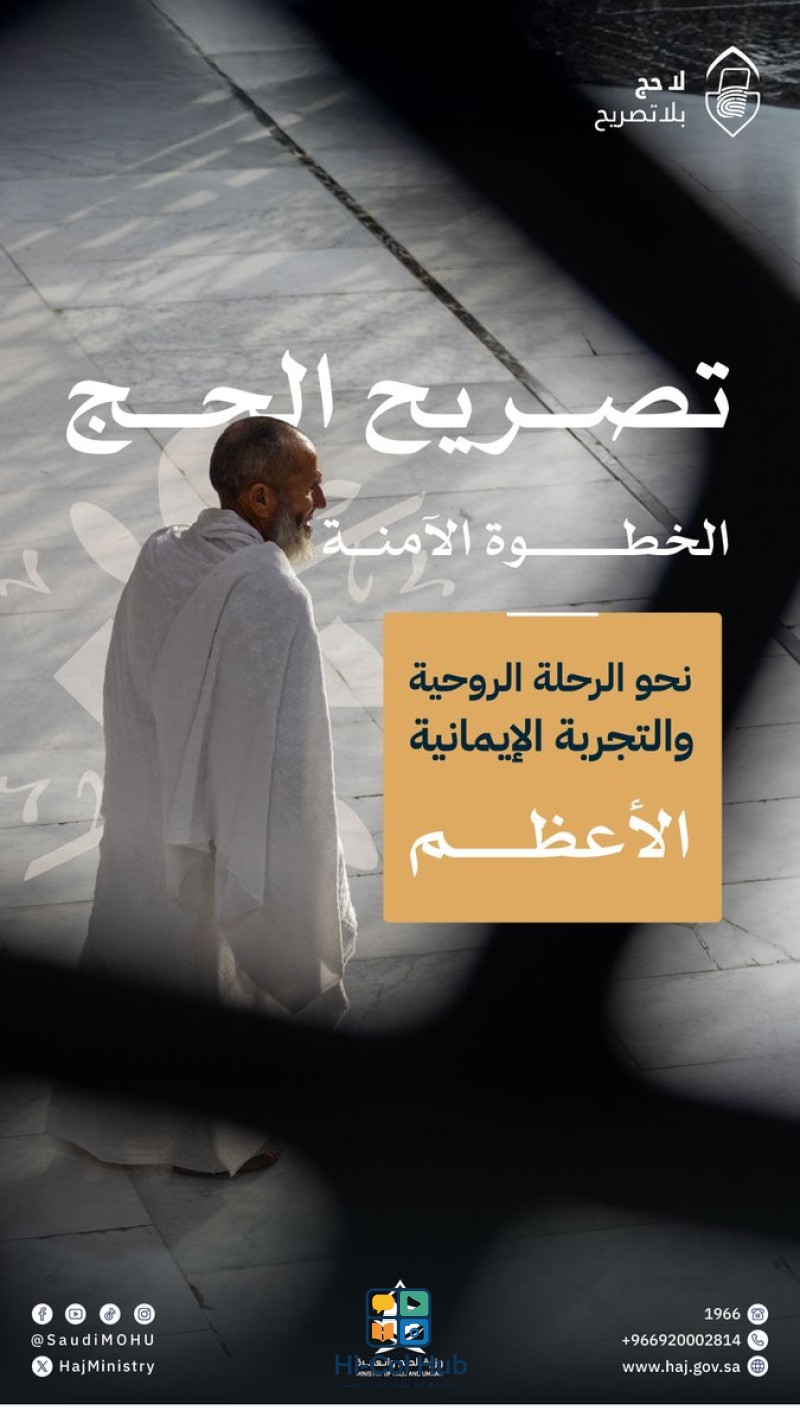 وجاء هذا التأكيد عبر حساب الوزارة الرسمي على منصة "إكس" (تويتر سابقاً)، حيث ذكرت: "الحصول على تصريح الحج أول وأهم خطوة في رحلة الحاج؛ بغيره يتعذَّر الوصول إلى المشاعر المقدَّسة، ويصعُب أداء المناسك".