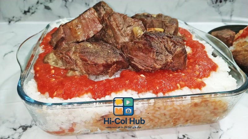 - إضافة طبقات النكهة: تُوزع طبقة سخية من الأرز الأبيض المفلفل فوق الخبز المشرب بالمرق. بعد ذلك، تُسكب صلصة الطماطم بالخل والثوم المحضرة فوق طبقة الأرز بشكل متساوٍ. وأخيرًا، تُوزع قطع اللحم المسلوق (والتي يمكن تحميرها قليلاً في السمن لمزيد من النكهة) على وجه الطبق.