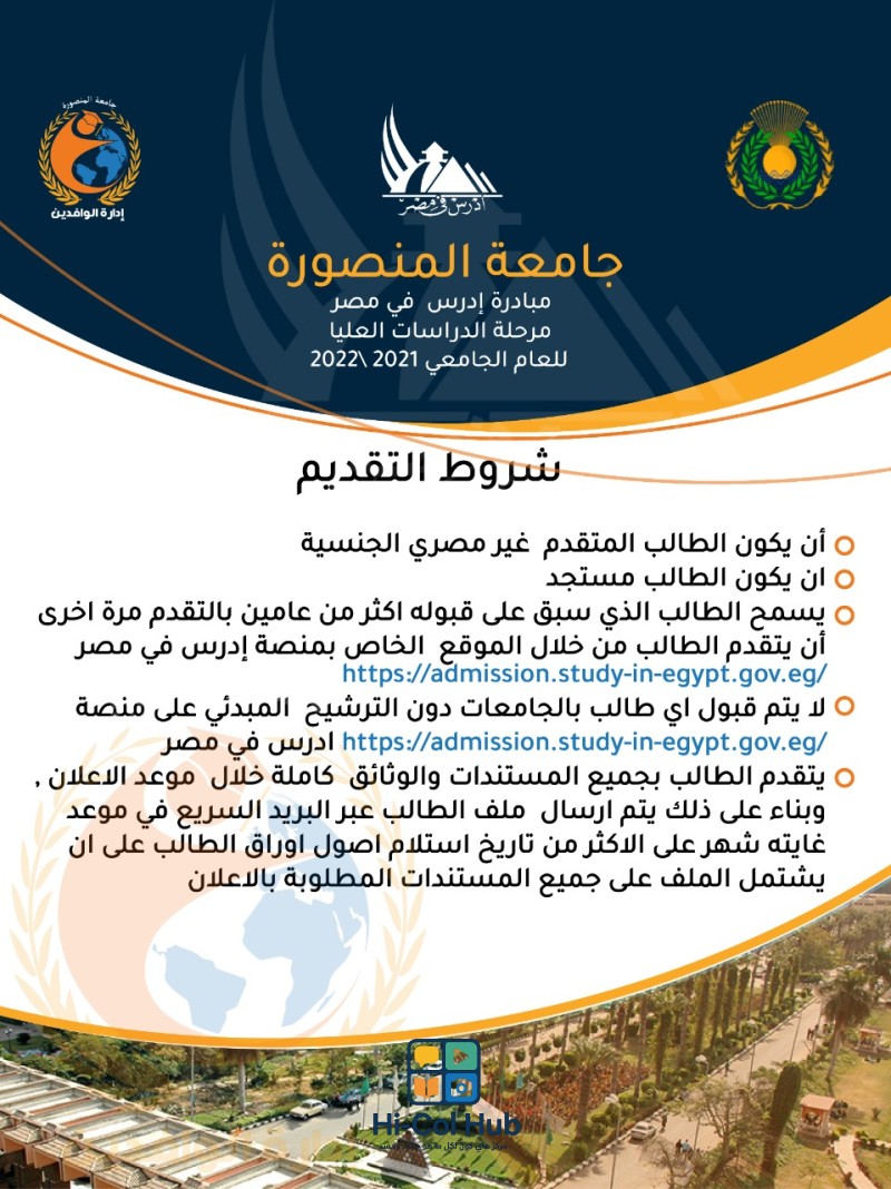 تعتبر جامعة المنصورة بحق من افضل الخيارات المتاحة للطلاب الوافدين الراغبين في اكمال دراسات الماجستير او الدكتوراه في مصر فالجامعة لا تقدم فقط برامج اكاديمية متنوعة بل توفر ايضا بيئة تعليمية محفزة ومتقدمة