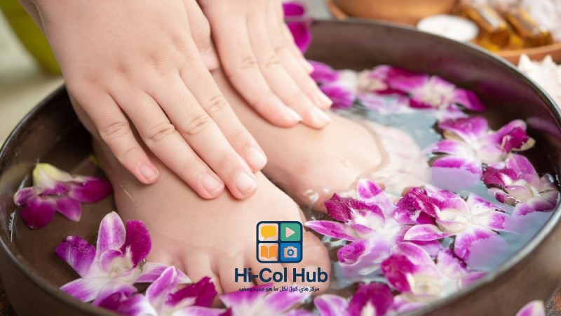 نقع القدمين: املئي الحوض بالماء الدافئ (ليس ساخنا جدا) واضيفي اليه ملح الابسوم او املاح الاستحمام او الزيوت العطرية انقعي قدميك في الماء لمدة 10 الى 15 دقيقة هذه الخطوة تساعد على تليين الجلد والاظافر وتسهيل الخطوات التالية وتمنحك شعورا بالاسترخاء