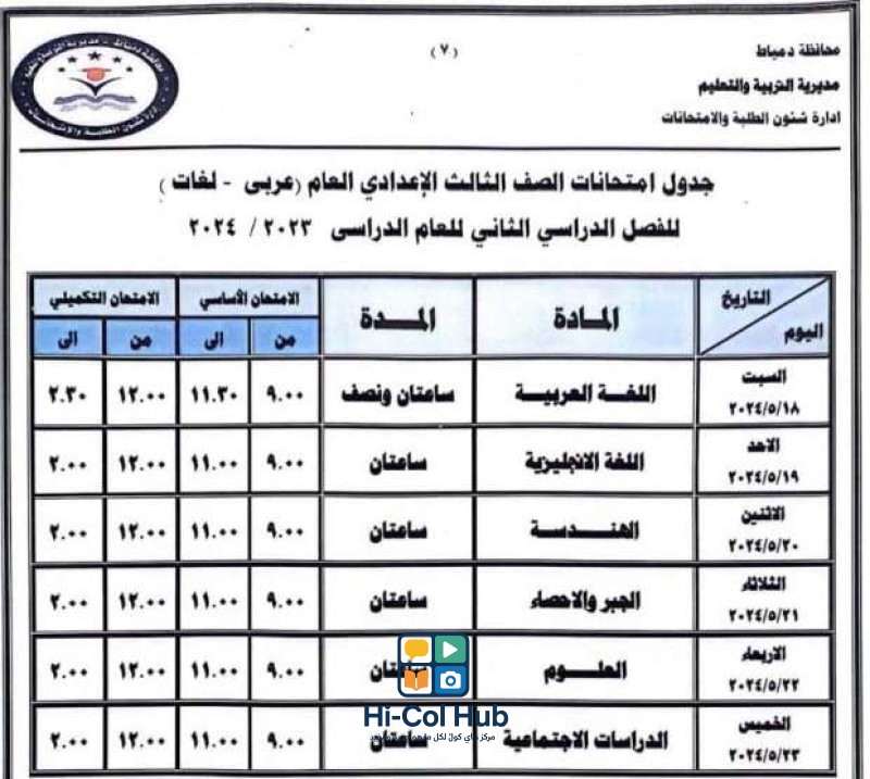 جاء الجدول المعتمد لامتحانات الصف الثالث الإعدادي في محافظة الإسكندرية على النحو التالي:
