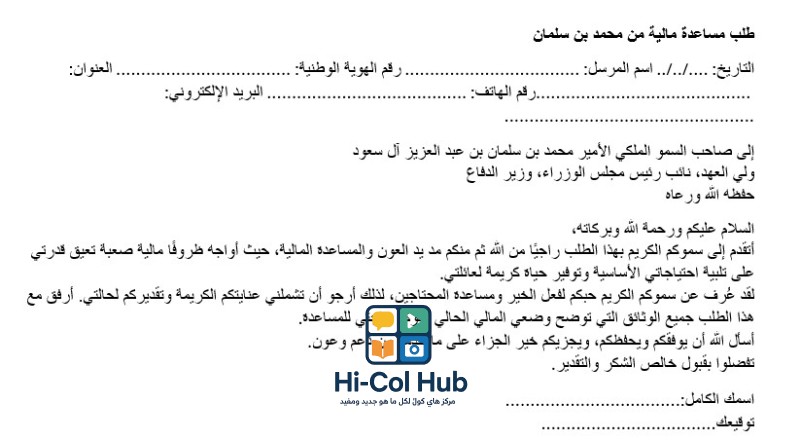 يمكن اتباع الصيغة التالية عند تقديم طلب مساعدة مالية إلى الديوان الملكي، وهي نموذج شائع وفعّال عند الكثير من الحالات